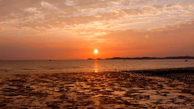 Sunset over a tranquil beach with boats