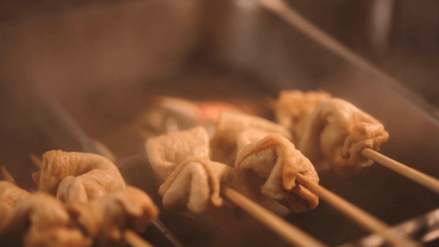 Sight of fish cake skewers steaming and cooking at night