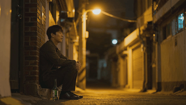 Depressed man walking down an alleyway on a rainy night holding a bottle of soju