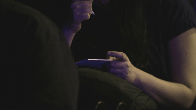 Person writing notes in dark room
