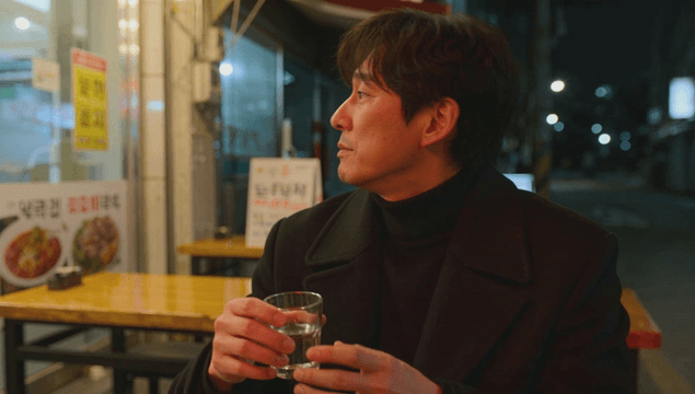 Woman sitting alone by the window on a rainy day, drinking soju.