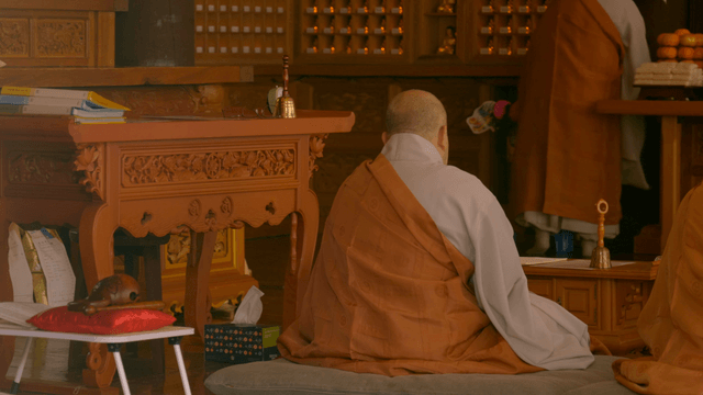 Middle-aged woman praying in a mountain temple wearing traditional hanbok