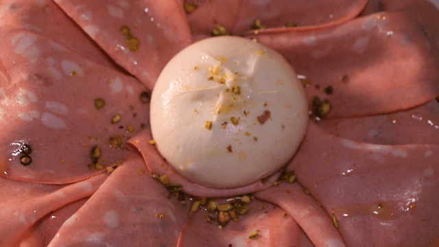 A plate with burrata and mortadella