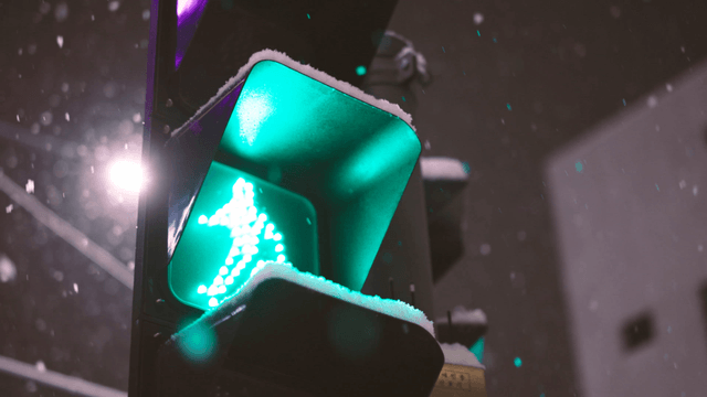 Snowy night with a red traffic light