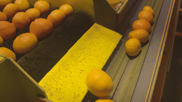 Mandarins on a conveyor belt in a factory