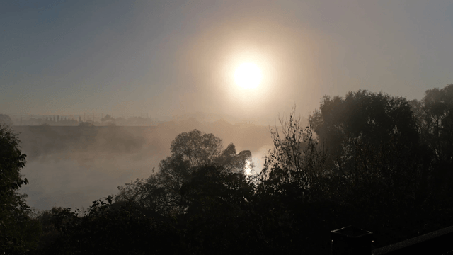 Sunrise over a misty river