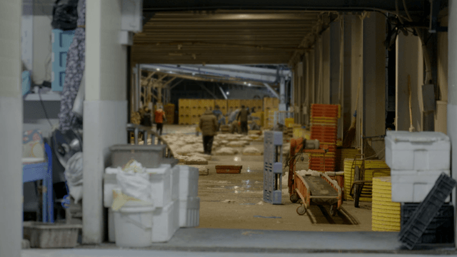 Baskets piled up in front of warehouse at early morning fish market and workers