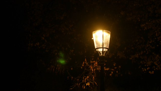 Bright streetlight illuminating autumn leaves at night