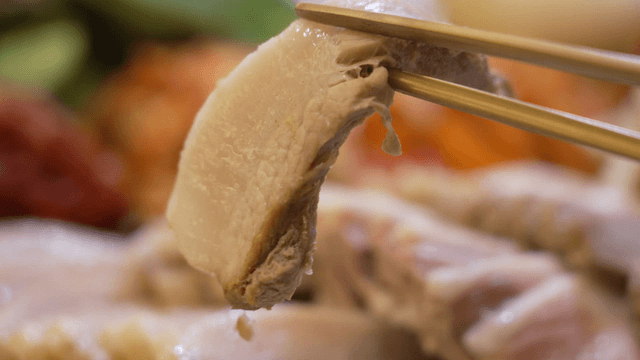 Chopstickful of Korean boiled pork with bok choy kimchi