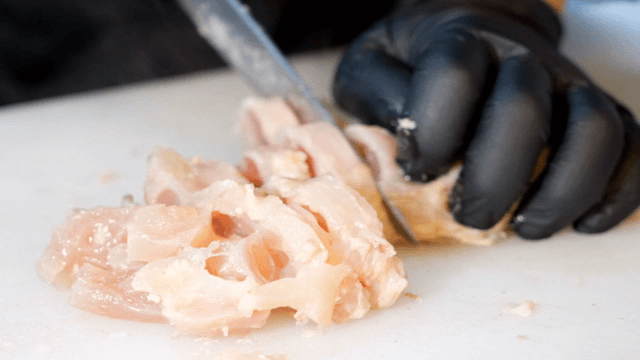 Raw chicken being cut on a cutting board