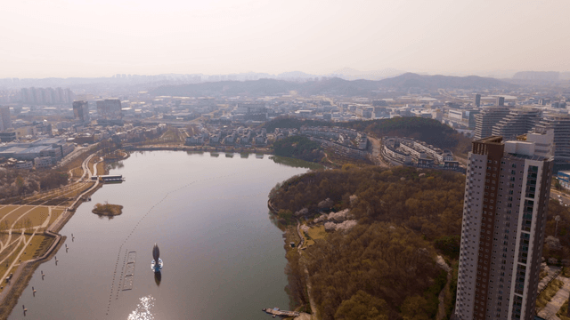 Cityscape with high-rise buildings and tranquil lake