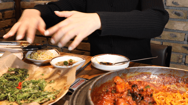 Person eating spicy Korean chicken jjagalbi with salad at restaurant