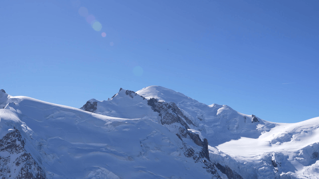 Snow-covered mountains under a blue sky
