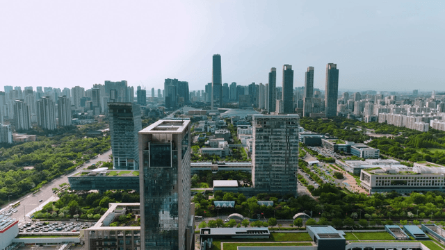 Modern city view with high-rise buildings and greenery