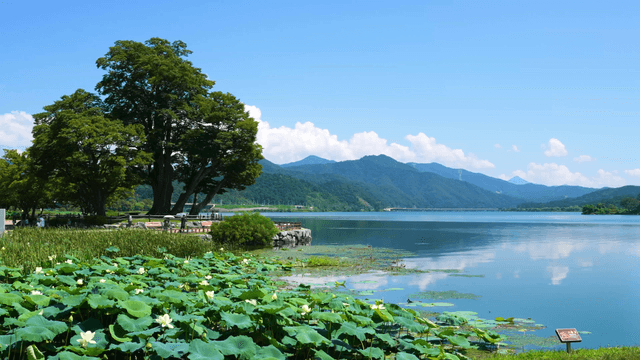 Green mountains with lush forests surrounding a tranquil lake