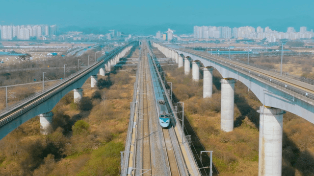 High-speed trains run on long stretches of track between the forest and the city