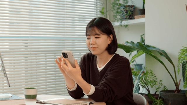 Woman smiling while using a smartphone