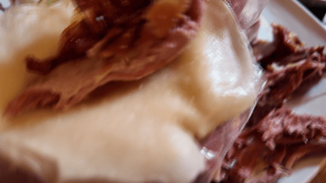 Chopsticks holding stir-fried shredded potatoes with smoked duck pieces