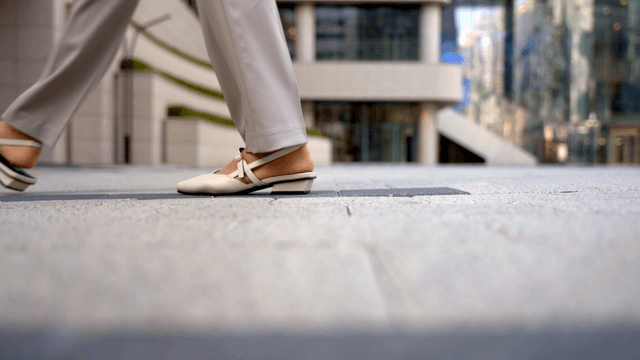 Office worker walking on sunlit sidewalk