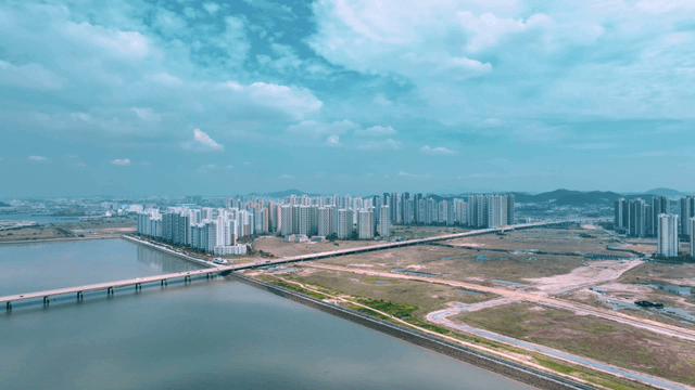 Modern cityscape with high-rise buildings overlooking the sea