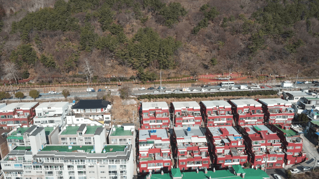 Aerial view of a residential area with cars
