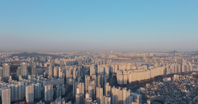 Bustling Seoul cityscape with a long straight boulevard on a clear day