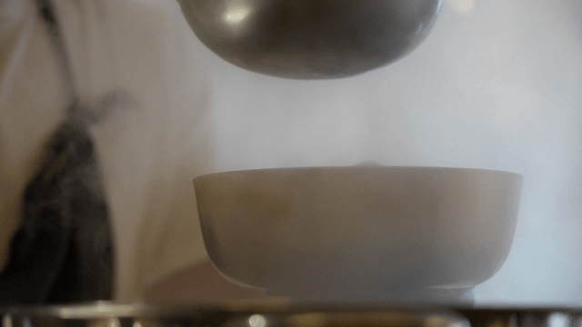 Hands serving a bowl of boiling soup