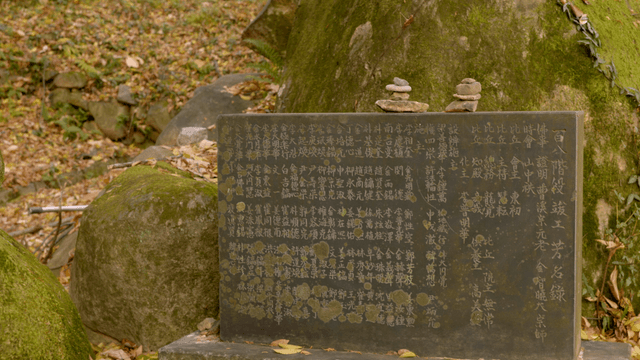 Stacked stones in a serene forest setting
