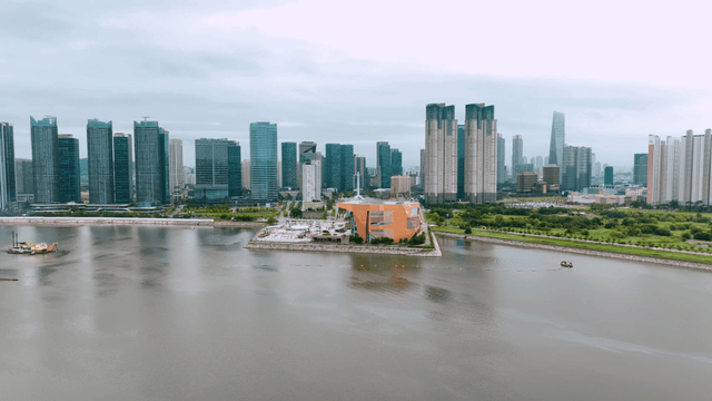 Snow-covered traditional Hanok buildings and modern high-rise buildings
