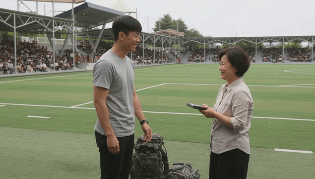 Son, looking depressed, delivers his luggage to his mother at military yard.