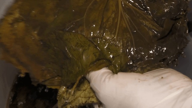Gloved hands stuffing minced meat between perilla leaves
