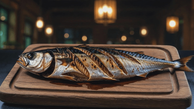 Grilled mackerel on a wooden board