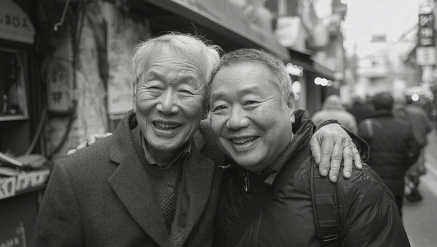 Two elderly men laughing together on a street