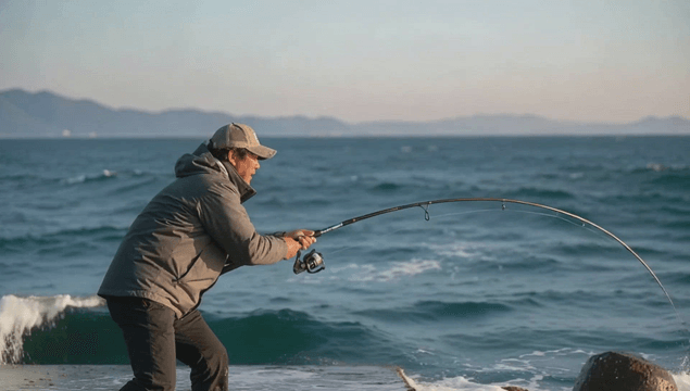 Old man fishing in rough waves
