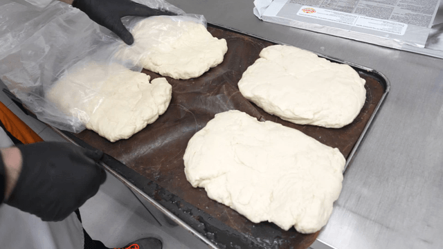 Wheat flour dough prepared for fermentation on a stainless steel tray