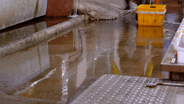 Fish market with water flowing on floor