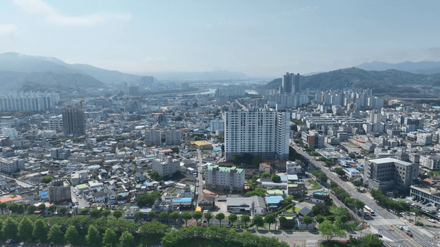 Hazy Cityscape in the Early Morning with a River and Bridge
