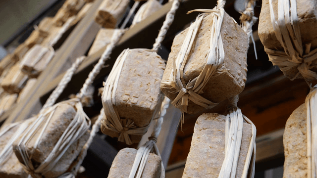 Fermented soybean blocks hanging indoors