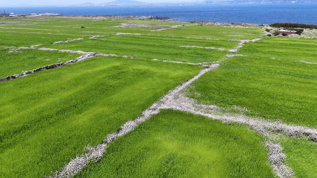 Coastal village with green fields and colorful homes along a winding road by the sea
