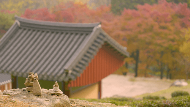 Traditional Korean temple surrounded by autumn foliage