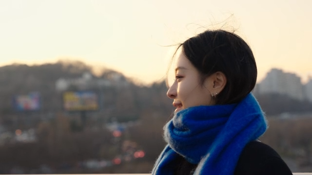 Woman in a blue scarf smiling on a bridge