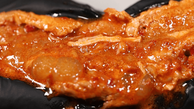 A close-up of hands kneading spicy seasoning into green vegetables using a gloved hand