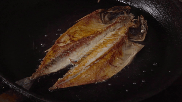 Fish being cooked on a hot pan with oil