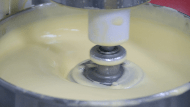 Chef mixing finely crushed ice with minced meat in industrial mixer