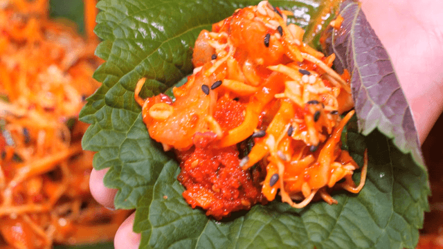 Making kimchi by adding chili pepper seasoning to perilla leaf kimchi