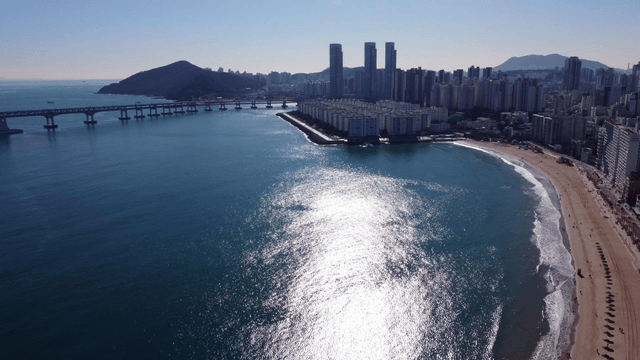 Busan, a modern city with high-rise buildings and calm, blue sea