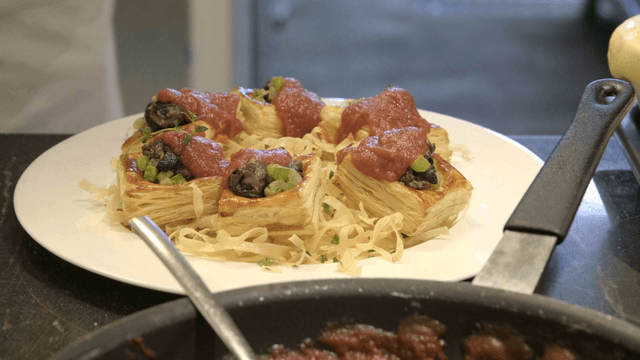 Chef preparing a pastry dish in the kitchen