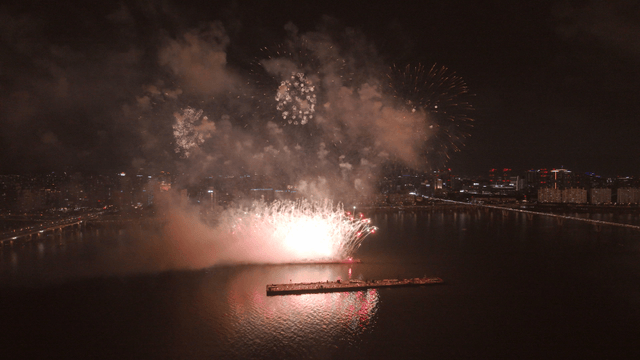Spectacular Fireworks over the Cityscape and River at Night