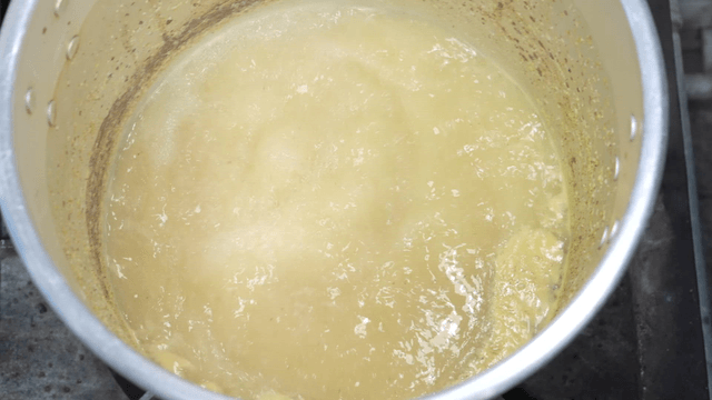 A pot of boiling liquid with foam