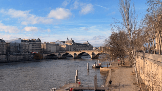 River scenery with European bridges and buildings
